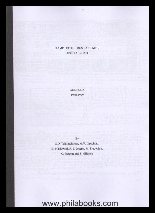 Tchilinghirian, S.D./ Lipschutz, M.V./ Maslowski, I.B./ Joseph, R.L./ Frauenlob, W.,/ Faberge, O. and Gilbrick, S., Stamps of the Russian Empire Used Abroad, Addenda 1960-1979, Zusammenstellung der umfangreichen Nachträge erschienen ab der Ausgabe Nr. 28 bis 56 im 'British Journal of Russian Philately' in einfachen, aber lesbaren FOTOKOPIEN, wichtige und meist fehlende Ergänzung zu dem 6-bändigen Hauptwerk von Tchilinghirian/ Stevens, ca 110 S. #57523