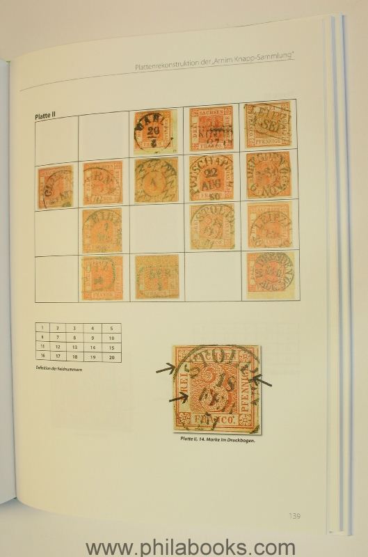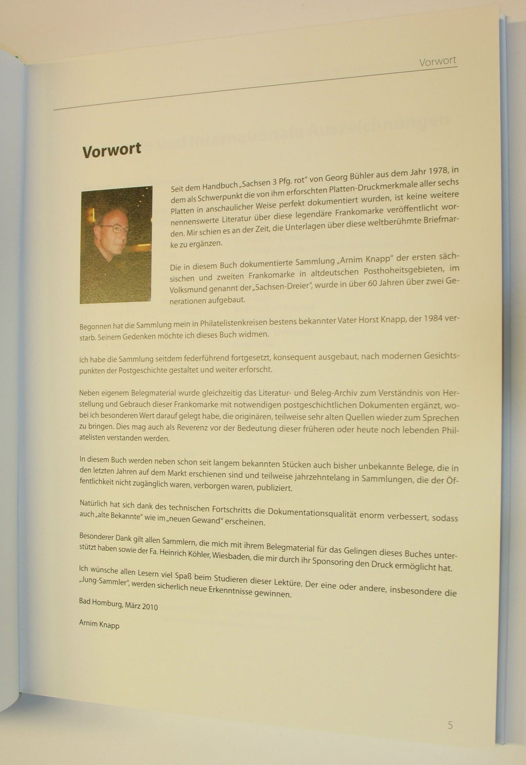 Knapp, A., Der 'Sachsen-Dreier' der Königlich Sächsischen Postverwaltung Ausgabe am 1. Juli 1850, Eine Dokumentation der Entwicklung und Verwendung aus der 'Arnim Knapp-Sammlung' und andere wichtige Quellen, Heinrich Köhler, 2010, Leinen mit Schutzumschlag, limitierte und nummerierte Auflage von 500 Exemplaren, Farbe, 190 S., mit zahlr. Abb., enthält Angaben zur Entstehung der Briefmarke mit anschaulich illustrierten Details zu ihrer Herstellung und Verwendung, darin insbesondere Kapitel zu den Platten, Einheiten, Entwertungen und Fälschungen, auch berühmte Sachsen-Sammler und Sammlungen werden vorgestellt, eine wichtige Ergänzung zum Bühler-Handbuch von 1978! #57530