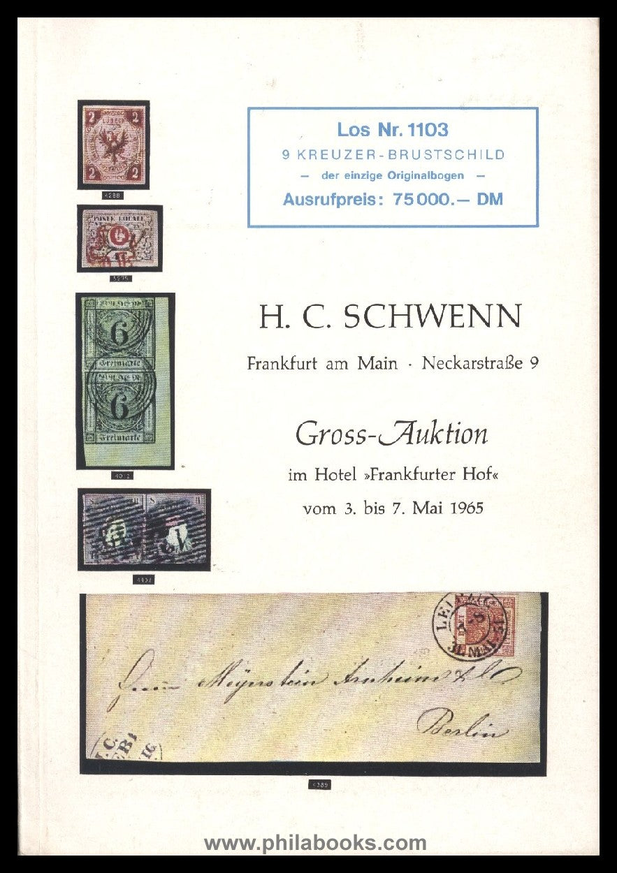 Schwenn, H.C., Auktion, 03.-07.05. 1965, (1.Auktion), 5400 Lose, 88 s/w-und 9 Farbtafeln , hier ein gutes Katalogset, Papier des Kataloges unvermeidlich gebräunt, sonst sehr frisch erhalten, die Tafeln ebenfalls frisch erhalten, lediglich die äußeren Seiten mit geringer Randtönung, mit der Vorankündigungsbroschüre zur Auktion sowie der Rücklosliste in Kopie (EL nicht existent), in dieser Komplettheit und Erhaltung selten! #57784