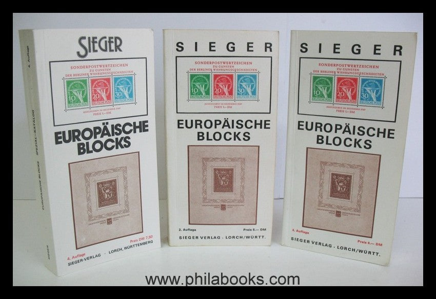 Sieger Block Spezialkatalog, hier eine kleine Sammlung, dabei die 2., 3., 4., 6.-10. Auflage (1992, die 6. Auflage mit Sonderteil Ost-Europa, farbig, bis ca 480 S. Umfang, 9 Kataloge. #59085