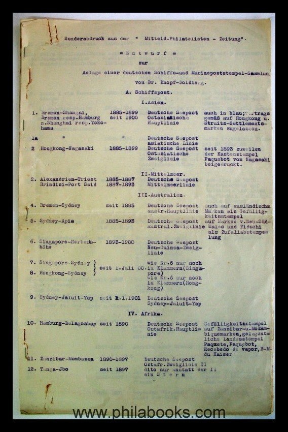 Knopf-Goldberg, Dr., Entwurf zur Anlage einer deutschen Schiffs- und Marinepoststempel-Sammlung, Sonderabdruck aus der 'Mitteld. Philatelisten - Zeitung', o. J., (um 1910), 11 S., hektographierte und gehefte Liste, selten, einige Heftklammerrostflecken auf der Titelseite, ansonsten gut erhalten #59287