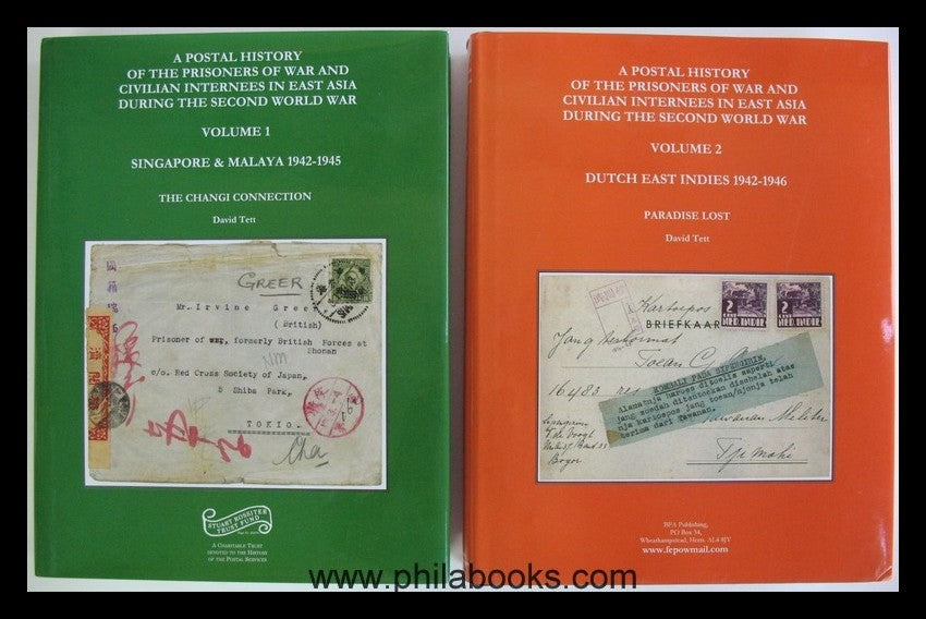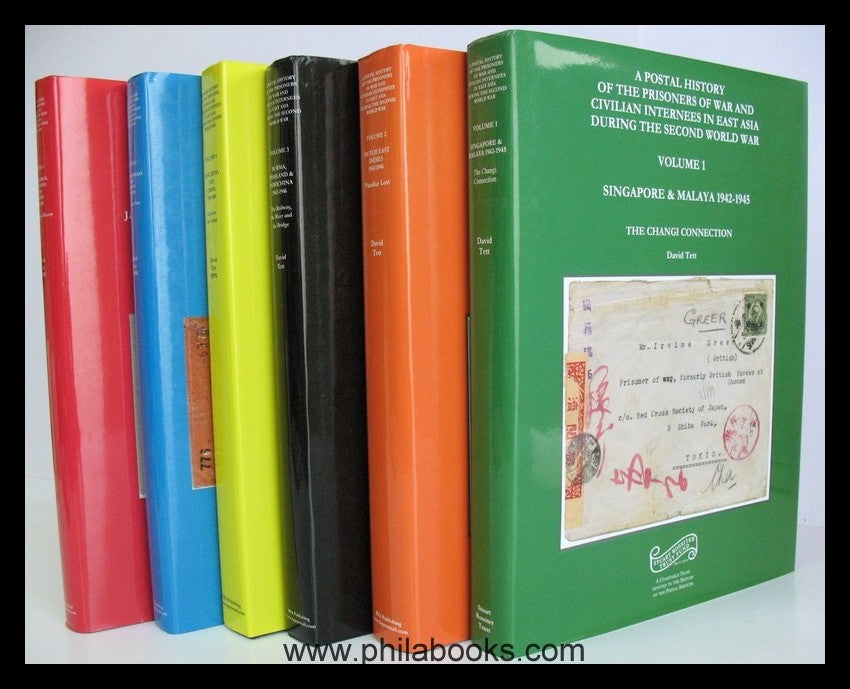 Tett, D., A Postal History of the Prisoners of War and Civilian Internees in East Asia during the Second World War, Volume 1-6, 2002-2010, Kriegsgefangenen-Handbuch in 6 Bänden kpl., Leinen mit Schutzumschlag, ca 2500+ S., mit vielen, oft farbigen Abb., die Schumschäge wie meist leicht fingerfleckig und Band 4 an der Kante oben gering verfärbt (siehe Scans), sonst gut, fast sehr gut erhalten, gesuchtes Ausgabe, Band 2 mit Niederländisch-Indien ist bereits länger vergriffen, hier wieder einmal komplett lieferbar! #60169