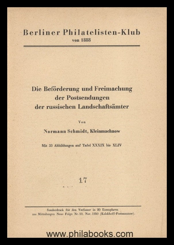 Schmidt, N., Die Beförderung und Freimachung der Postsendungen der russischen Landschaftsämter, Berliner Philatelisten-Klub von 1888, Sonderdruck für den Verfasser in 20 Exemplaren aus den Mitteilungen Neue Folge Nr. 20, November 1950, hier die 'No 17', 8 S., lose gefaltet, ein Blatt unten gering angetrennt, kpl. mit den 6 dazu gehörigen Tafeln, jeweils 2 mit Falz verbunden (etwas falzfleckig), aufgrund der kleinen wohl Auflage, schwierig besser zu bekommen #60207