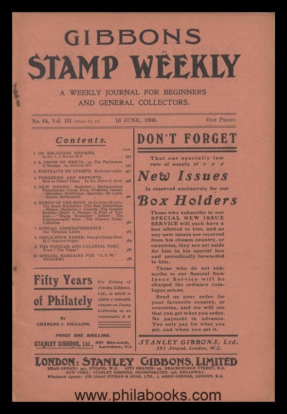 Gibbons Stamp Weekly, No. 24 Vol. III, 1906, hier ein Exemplar noch mit den gratis eingeklebten 4 Marken 'GRATIS STAMPS' , Nos. 30 to 34 #60334