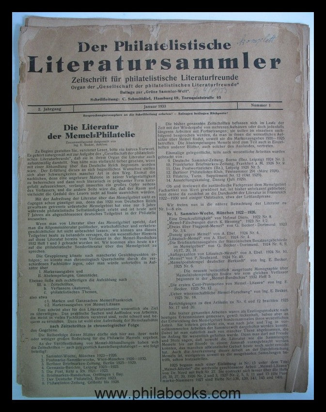 Der Philatelistische Literatursammler, Beilage zur 'Grüne Sammler-Welt', C. Schmittdiel, Hamburg, hier der 2. Jahrgang, 1933 kpl. in 12 Einzelheften, Papier unvermeidlich gebräunt, leichte Randmängel (sehr dünnes Papier) erschien nur 1932-35, selten #60352