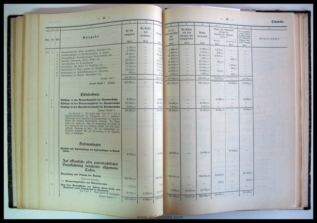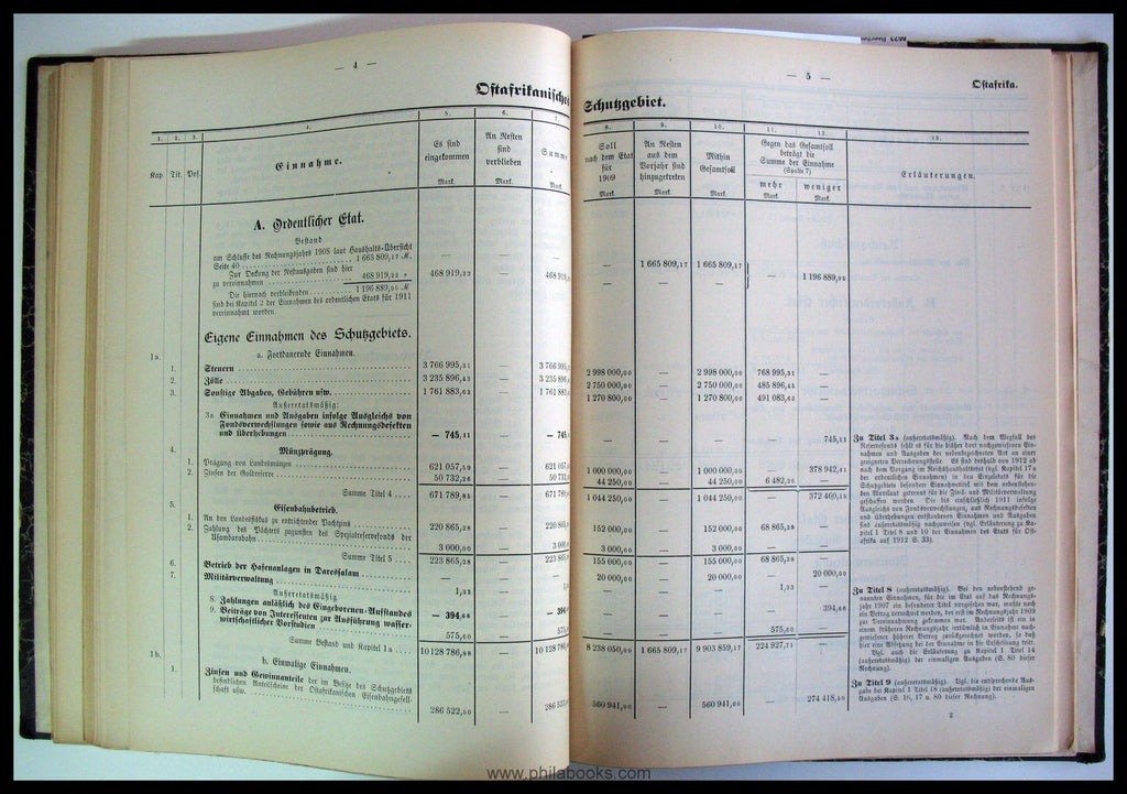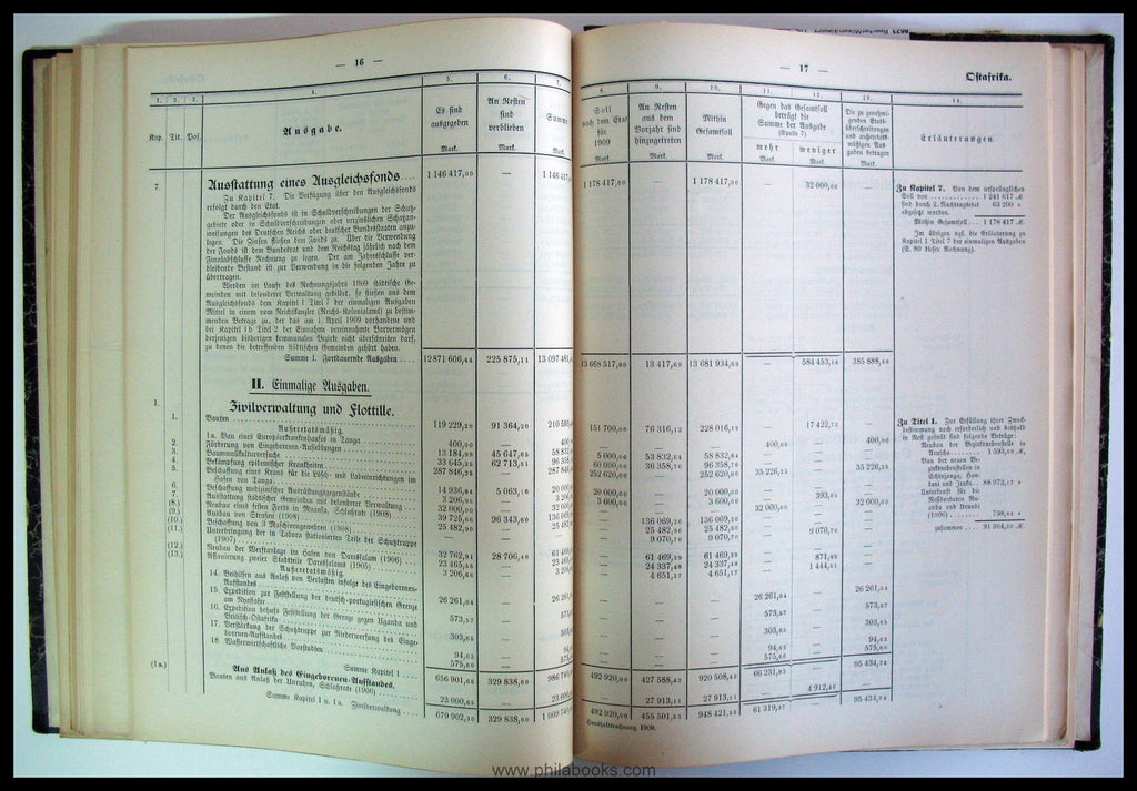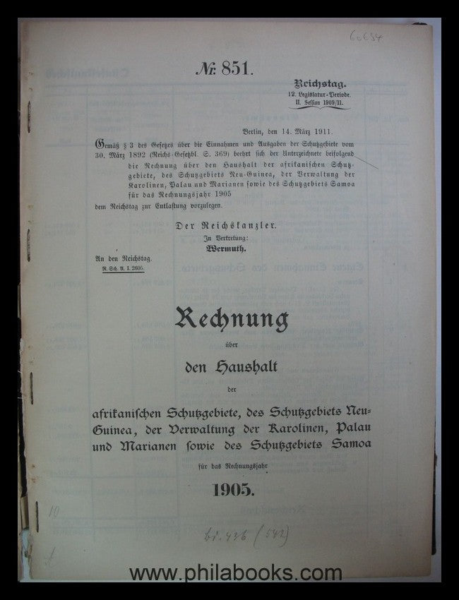 Reichskanzler Wermuth, An den Reichstag, Gemäß $ 3 des Gesetzes über die Einnahmen und Ausgaben der Schutzgebiete, Rechnung über den Haushalt der afrikanischen Schutzgebiete, des Schutzgebiets Neu-Guinea, der Verwaltung der Karolinen, Palau und Marianen sowie des Schutzgebietes Samoa der Rechnungsjahre 1905 - 1909 sowie die Rechnungen über den Haushalt des Schutzgebietes Kiautschou für die Rechnungsjahre 1905 - 1907, ca. 500 S., in einem Band geb., Einband unerhebliche Mängel, feste Bindung, enthält viele interessante Angaben für den forschenden Postgeschichtler, selten #60694