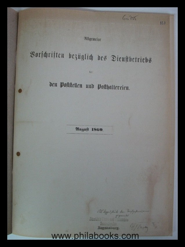 Thurn und Taxis-Archiv Regensburg, Allgemeine Vorschriften bezüglich des Dienstbetriebes bei den Poststellen und Posthaltereien, 1860, 31 S., einfache sehr alte, aber gut lesbare gebundene KOPIE, #60755