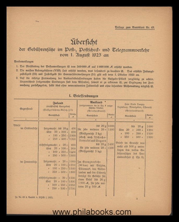 Übersicht der Gebührensätze im Post-, Postscheck- und Telegrammverkehr vom 1. August 1923 an, Beilage zum Amtsblatt Nr. 43, 16 S., Original, Papier wie üblich gebräunt, sonst ordentlich erhalten, als Original nicht häufig #62503