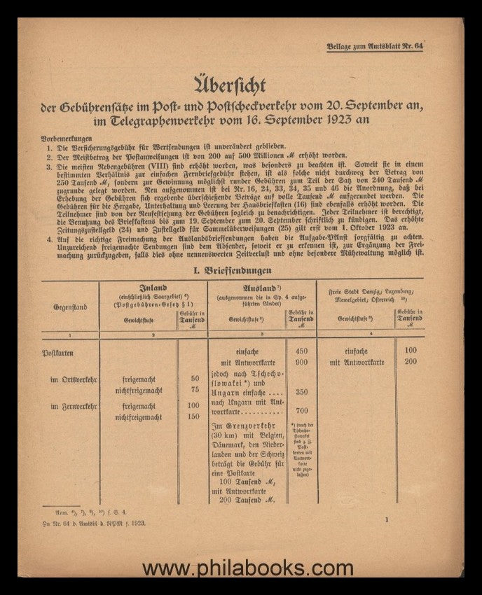 Übersicht der Gebührensätze im Post-, Postscheckverkehr vom 20. September an, im Telegraphenverkehr vom 16. September 1923 an, Beilage zum Amtsblatt Nr. 64, 16 S., Original, Papier wie üblich gebräunt, sonst ordentlich erhalten, als Original nicht häufig #62505