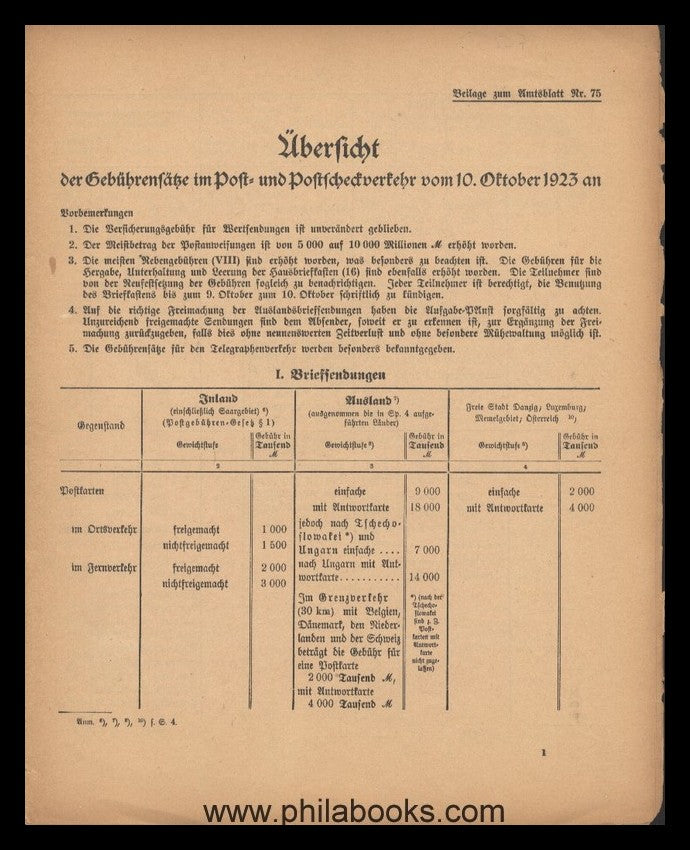 Übersicht der Gebührensätze im Post- und Postscheckverkehr vom 10. Oktober 1923 an, Beilage zum Amtsblatt Nr. 75, 15 S., Original, Papier wie üblich gebräunt, sonst ordentlich erhalten, als Original nicht häufig #62507