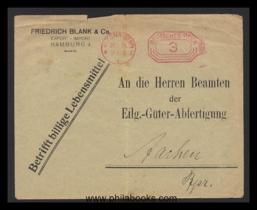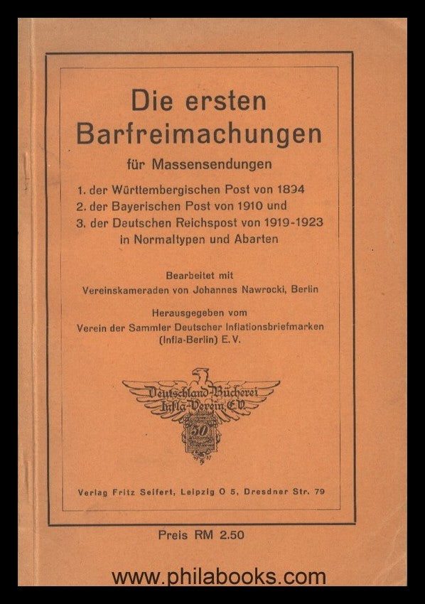 Nawrocki, J., Die ersten Barfreimachungen für Massensendungen, herausgegeben von Infla Berlin, Originalausgabe, 1937, Kat. Württemberg 1894, Bayern 1910 u. D. Reich 1919-23, 80 S., Abb., hier ein so genanntes 'DURCHSCHOSSENES' Exemplar mit eingefügten Blankoseiten für Mitarbeiter mit einem uns unbekannten Exlibris 'P.R.' (?), in guter Erhaltung, beiliegend noch ein ORIGINAL-BESTELLSCHEIN, der Nachtrag v. 1941 als Original, sowie ein Musterbeleg #62874