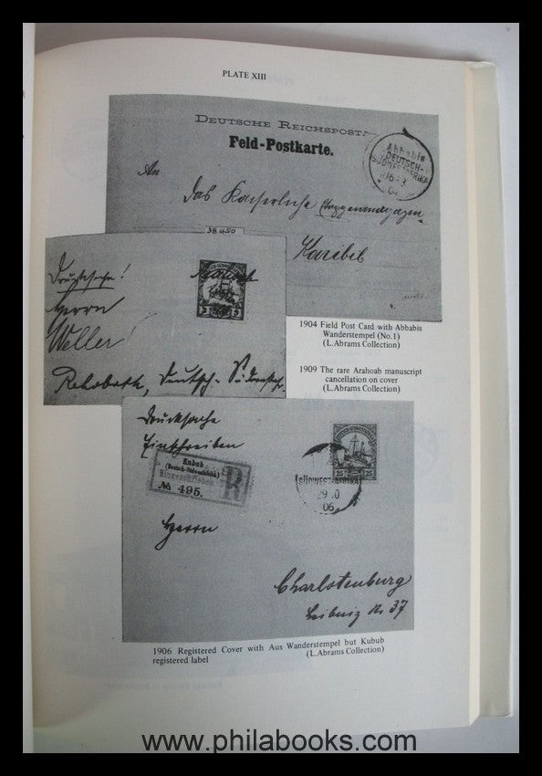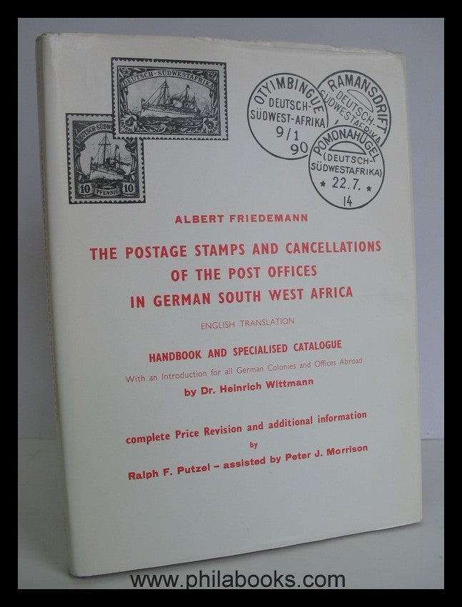 Friedemann, A., The Postage Stamps and Cancellations of the Post Offices in German South West Africa, English Translation, Handbook and Specialised Catalogue, Title of the German Original: Albert Friedemann, Die Postwertzeichen und Entwertungen der deutschen Postanstalten in den Schutzgebieten und im Ausland: Handbuch und Spezialkatalog, complete Price Revision and additional information by Ralph F. Putzel-assisted by Peter J. Morrison, South Africa, 1980, Stempelkatalog-und Handbuch, 196 S., 64 Abbildungstafeln sowie auch noch mit Abb. im Textteil,, Kunstleder mit Prägung und Schutzumschlag (Randmängel) sonst gutes Exemplar, ex Herry Schaefer, ehemaliger Vizepräsident der UBS #62975