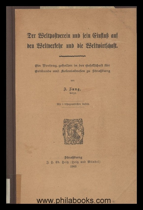 Jung, J., [Postrat], Der Weltpostverein und sein Einfluß auf den Weltverkehr und die Weltwirtschaft, Ein Vortrag gehalten in der Gesellschaft für Erdkunde und Kolonialwesen zu Straßburg, Straßburg 1903, IV S., 43 S./ 3 S. + 5 Falttafeln, hier ein schönes Bibliotheksexemplar in Halbleinen, der Originaldeckel der nur als Broschur verausgabten Schrift wurde vorne aufgeklebt, die 5 ausfaltenbaren Übersichtstafeln zur Entwicklung des Weltpostverkehrs im Anhang sauber mit eingebunden, gutes Ex. #63093