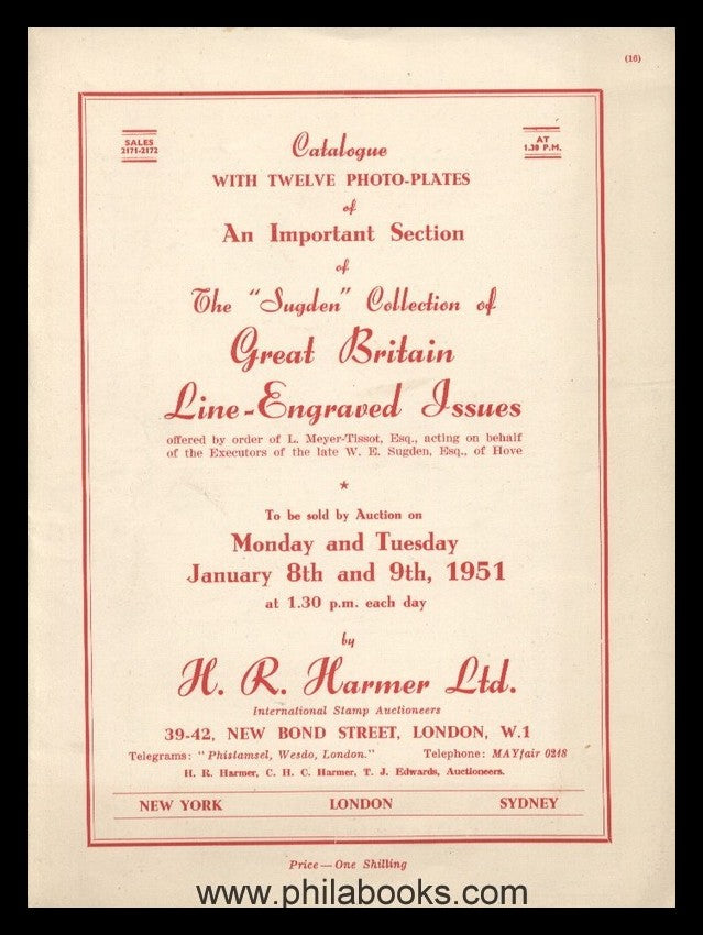 Harmer, H.R., Catalogue with Twelve Photo-Plates of an Important Section of The 'Sudgen' Collection of Great Britain Line-Engraved Issues, London 08. - 09.01 1951, 35 S., 391 Lose, mit 12 Abbildungstafeln, gutes Ex., mit Original-EL #63303