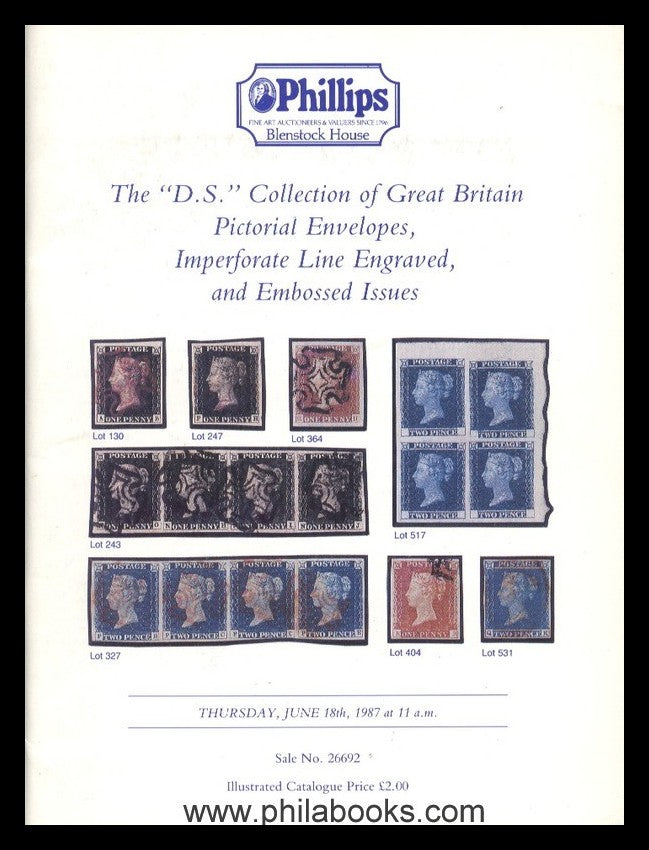 Phillips, 'D.S.' Collection of Great Britain Pictorial Envelopes, Imperforate Line Engraved, and Embossed Issue, 18.06.1987, The s, 566 Lose, 64 S., zahlreiche Abb., mit EL #63444