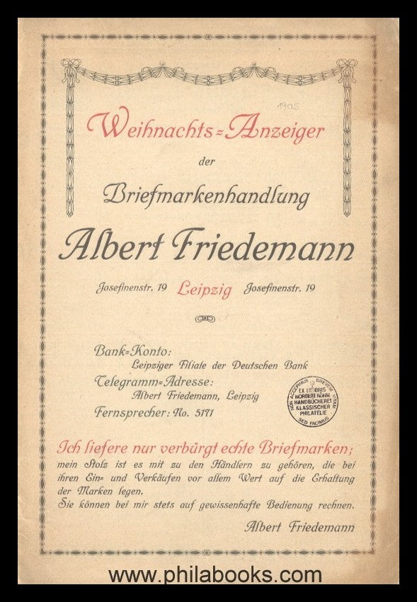 Friedemann, A., Weihnachts-Anzeiger, ca 1905, 12-seitge Firmenbroschüre mit gefälligen farbigen Markenabb., unbedeutende Alters-und Gebrauchsspuren, gut erhalten, mit Bibliotheksstempel Norbert Röhm, selten, erstes uns bekanntes Exemplar, sehr schöne Dokumentation aus der Anfangszeit von A.F., des dann erst späteren großen Kolonialexperten #63490