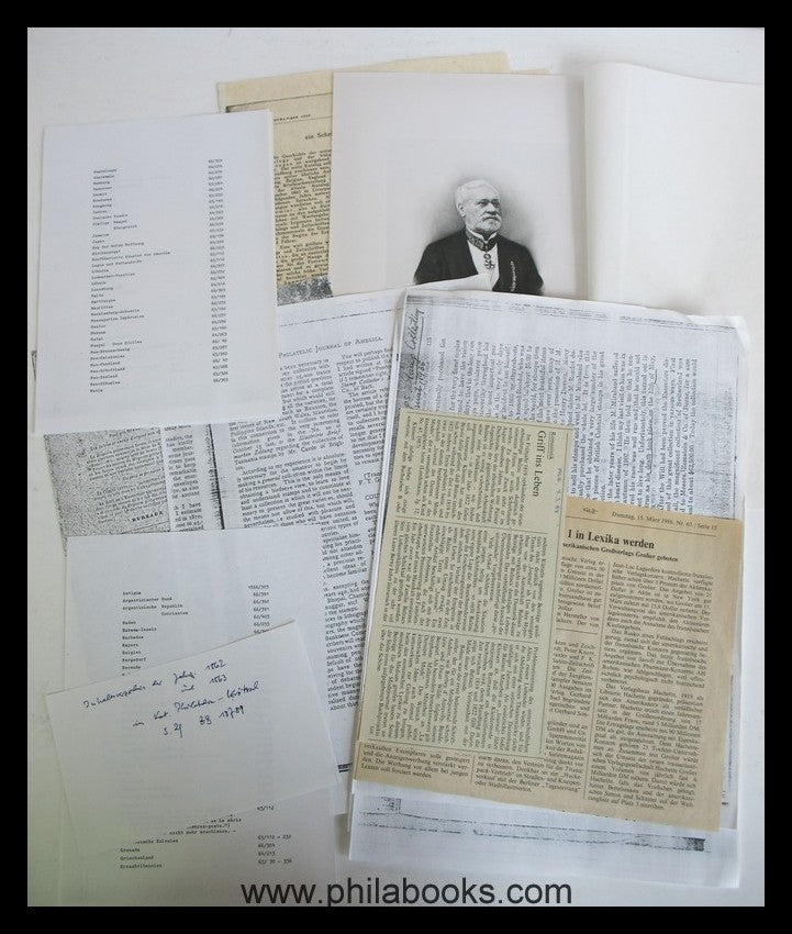 NATALIS RONDOT, Les Timbres-Poste de tous les Etats de Globe en 1862, Prèmiere Partie, Europe, Édité par la Revue 'Philatelisme', Anvers, 1935, hier ein sehr gutes Exemplar, prächtig gebunden in Halbleder mit Buchecken und Lederschildchen, 200 S., mit Abb., DAZU die Biographie von Leon Galle über Natalis Rondot von 1902 mit weiteren nachgebundenen und auch beiliegenden Rechercheunterlagen, ex Norbert Röhm, in prächtigem Halbleder geb., eine ganz aussergewöhnliche Dokumentation über diesen frühen Philatelisten, ursprünglicher Zustand, nichts entnommen, beide Bücher sind selten! #63494