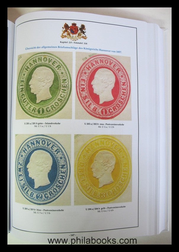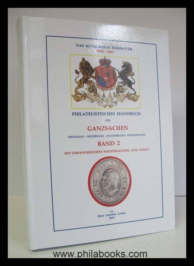 Lechte, H.-J., Das Königreich Hannover 1850-1866,, Band 2, Ganzsachen, Philatelistisches Handbuch für Stadtpostumschläge, allgemeine Umschläge, Postanweisungen, Portobriefumschläge und ein ausführlicher Nachtragsteil zum Band 1, 2013, 447 S., davon 378 Farbtafeln, nummerierte Auflage, hier Ex. 77/100, hier noch ein druckfrisches Exemplar! #63897