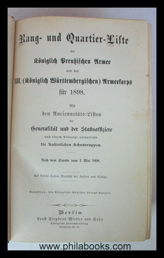 Rang- und Quartierliste der Königlich Preußischen Armee und des XIII. (Königlich Württembergischen) Armeekorps für 1898. Berlin, Mittler, 1898.