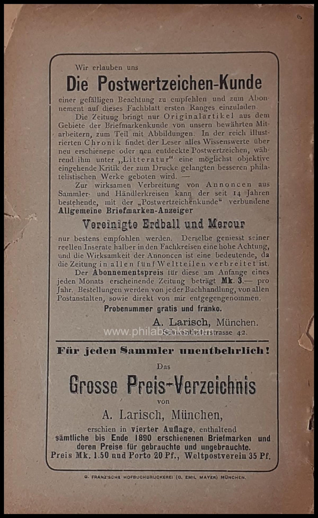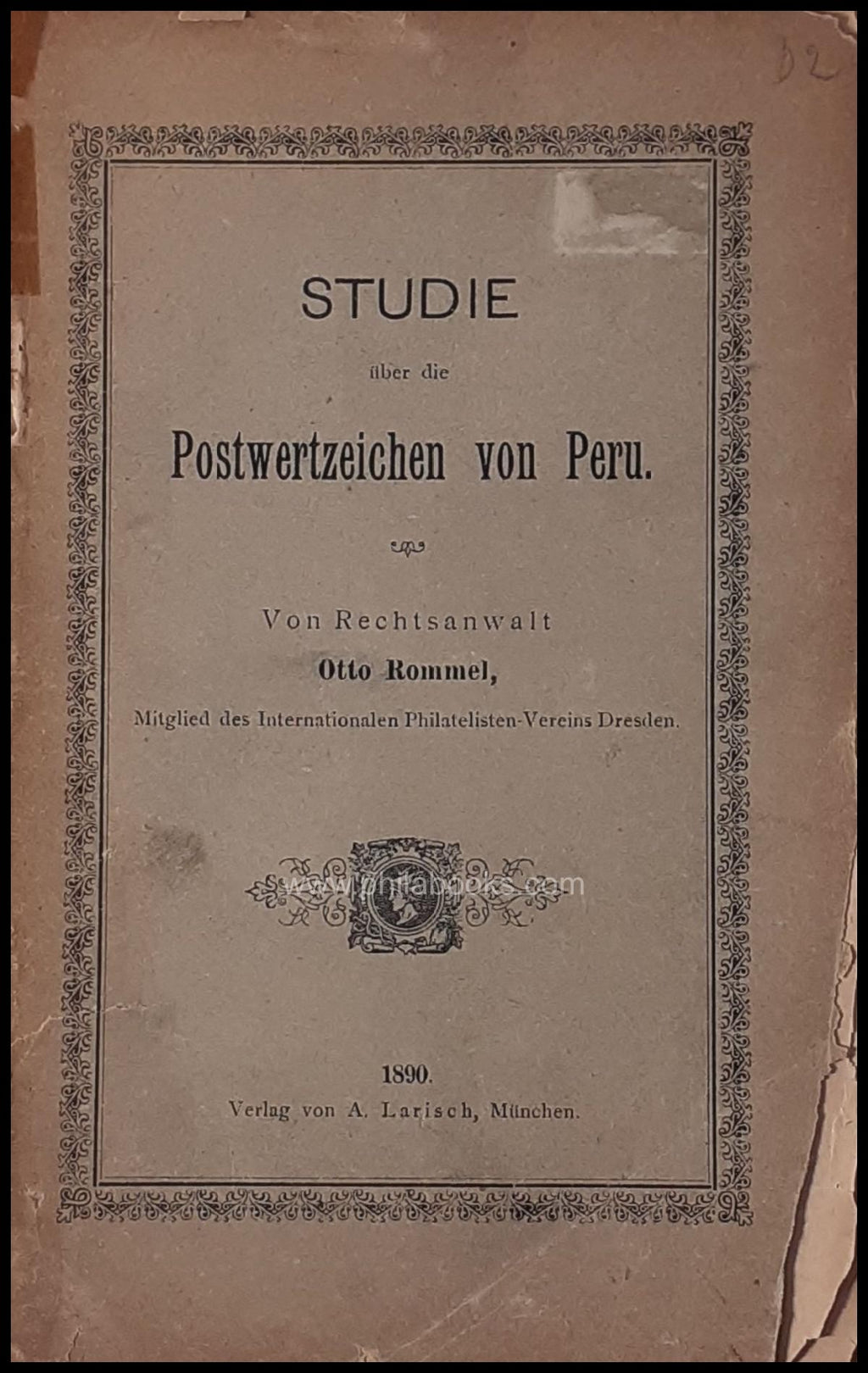 Rommel, O., Studie über die Postwertzeichen von Peru, Verlag A. Larisch, München, 1890, 86 S., der Umschlag wie allermeist Mängel (sehr dünnes, brüchiges Papier) und halb lose, die ersten beiden Seiten unten rechts Randmängel, siehe Scans, seltener Titel, eines der ersten Peru-Handbücher weltweit überhaupt! #64351