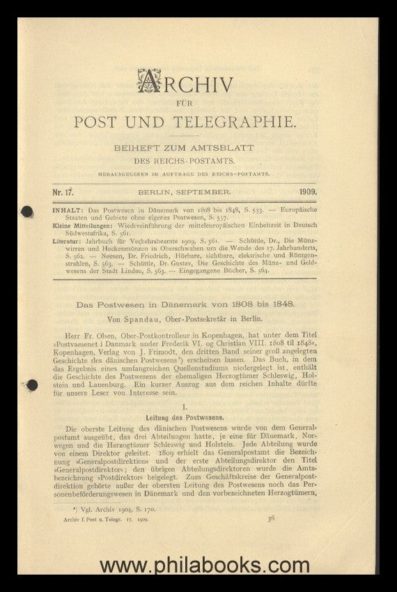 Spandau, Das Postwesen in Dänemark von 1808 bis 1848 und Europäische Staaten und Gebiete ohne eigenes Postwesen, in: Archiv für Post und Telegraphie, Nr. 17, 1909, gelocht #64508