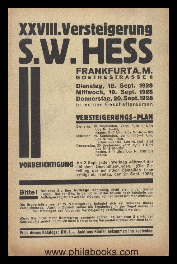 Hess, S. W. , 28. Auktion, Frankfurt am Main 18.-20.09.1928, Katalog kpl. mit Fototafeln, 3300+ Lose, 36 Tafeln, dabei Altdeutschland mit vielen Briefen, Deutsches Reich und Deutsche Kolonien, im Anhang Ergebnisse der 27. Auktion, Alters-und Gebrauchsspuren, interessanter Katalog #64757
