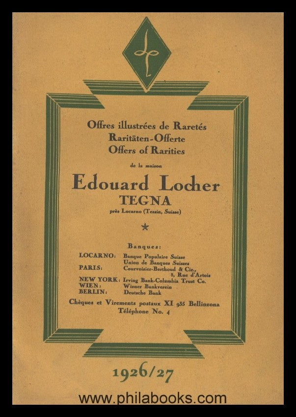 Locher, E., Offres illustrées de Raretés, 1926/27, Tegna, Locarno, Raritätenkatalog, 64 S., 918 Lose, 29 Tafeln, 'Vente de la belle collection de Mr S. Europe á des prix très favorables', klassische Marken aber auch GRI-Aufdrucke, Nachkriegsausgaben, Russsische Revolutionsmarken, Griechenland-Bogenangebote Große Hermesköpfe 10 und 20 Lepta (eine Tafel), leichter nicht störender Heftungsrost, nicht auf das Papier übergehend und andere leichte Altersspuren, interessantes Angebot, nicht häufig mehr zu finden #64845