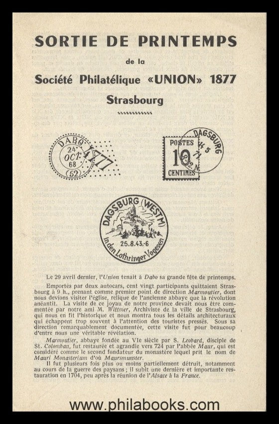 Société Philatélique 'Union' 1877, Strasbourg, Sortie de Printemps, o. J. (ca. 1970), kleine Postgeschichte von DABO/ DAGSBURG; 4 S., mit Abb. #65061
