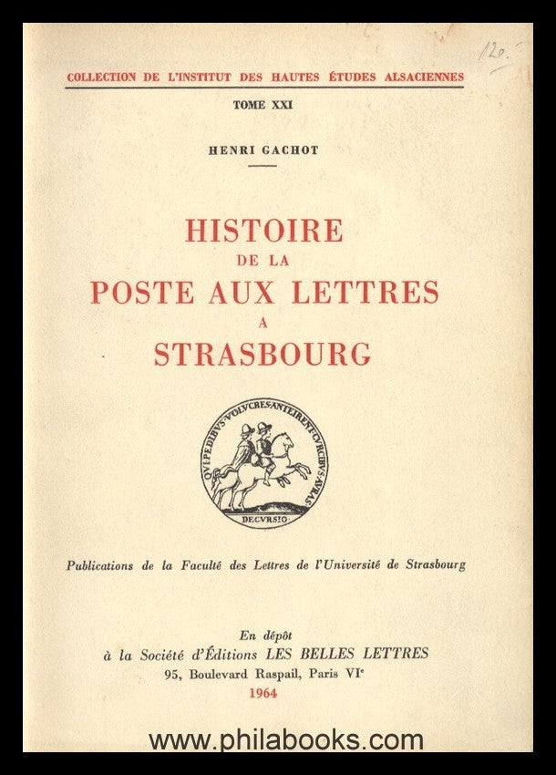 Gachot, Prof. Dr. H., Histoire de la Poste aux Lettres a Strasbourg, Collection de l'Institut des Hautes Études Alsaciennes, Tome XXI, 1964, 291 S., mit Abb., Postgeschichte von Straßburg bis 1945 mit Schwerpunkt bei der Vorphilatelie, Einband leichte Alters-und Gebrauchsspuren, sonst gut erhalten. #65062