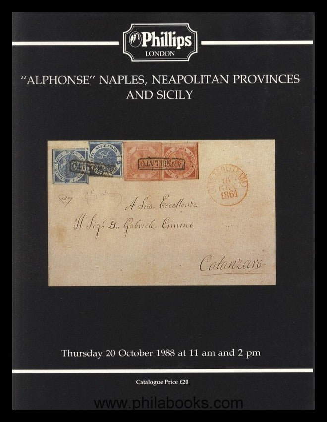 Philipps, London, 'Alphonse' Naples, Neapolitan Provinces and Sicily, 20.10.1988, Teil I der ehemaligen Sammlung Alphonse von Rothschild, 433 Lose, 145 S., mit zahlr. farbigen Abb. von Marken und Belegen, sehr gutes Exemplar, lediglich der Umschlag geringe Gebrauchsspuren, dieser Teil nicht häufig! #65135