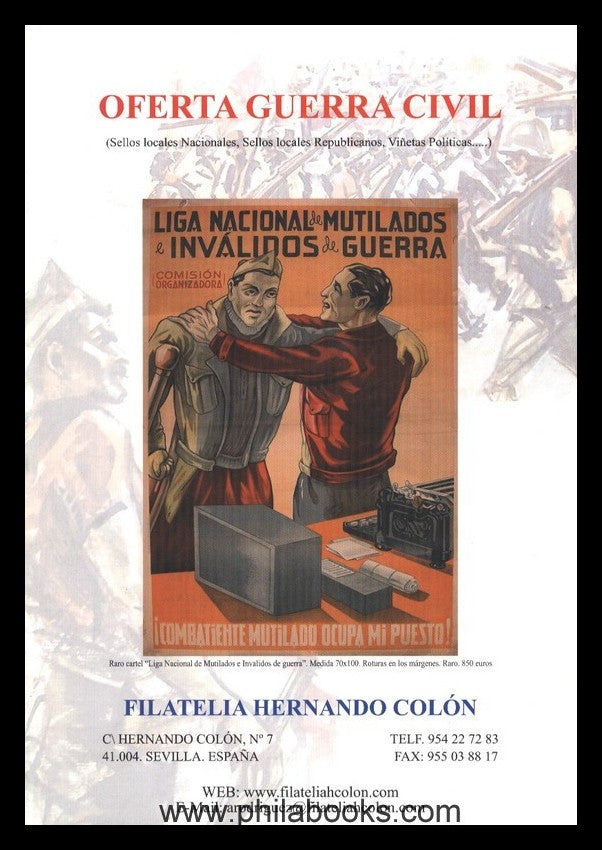 Filatelia Hernando Colón, Sevilla, Oferta Guerra Civil (Sellos locales Nacionales, Sellos locales Republicanos, Vinetas Políticas), Verkaufsangebot 2014, ähnlichem einem Spezialkatalog mit zahlr. farbigen Abb. Kunstdruckpapier, 110 S., #65492