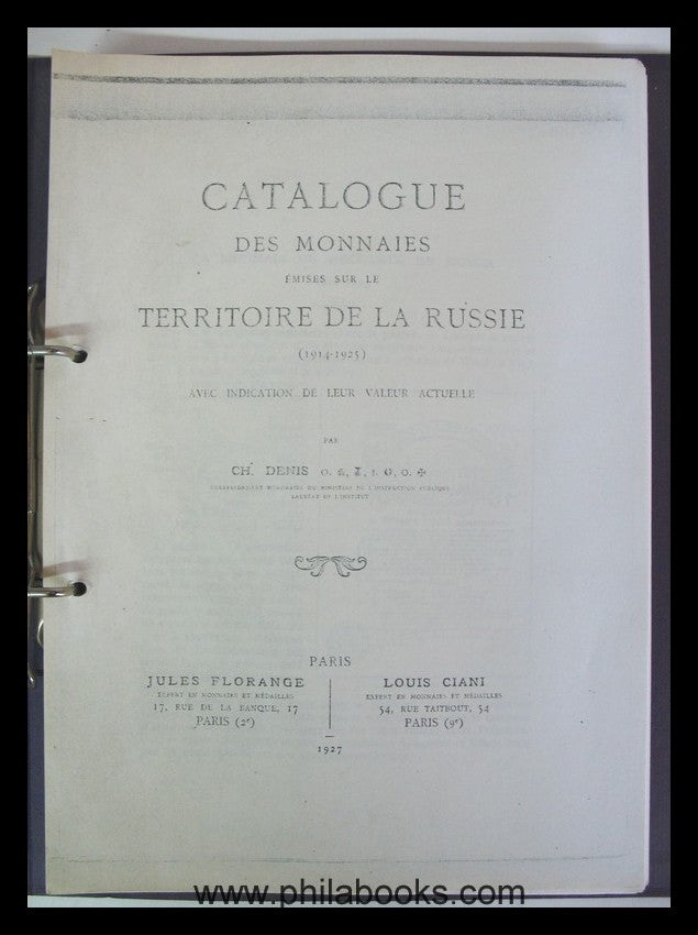 Denis, Ch., Catalogue des Monnais èmisis sur le Territoire de la Russie (1914-1925), Paris 1927, 121 S., hier als KOPIE im Ringbinder, Katalog der russischen Geldscheine, Original sehr selten, darin besonders die Stadt-und Semstwo-Ausgaben, Ukraine, Polen, besetzte Gebiete #65806