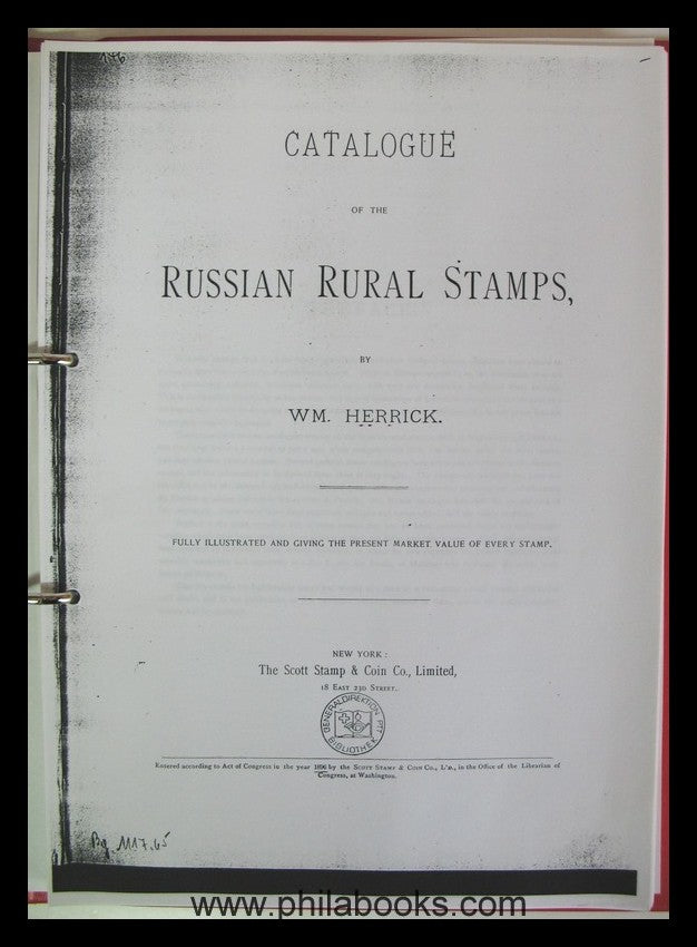 Herrick, Catalogue of the Russian Rural Stamps, The Scott Stamp & Coin Co., New York, 1896, 128 S. , mit Abb. und Bewertungen als einfache aber gut lesbare KOPIE im Ringbinder, auch als Kopie nicht häufig angeboten, Herrick war der Hauptimporteure russischer Semstwo-Marken, dabei noch einige weitere Unterlagen über Semstwo-Marken #65966