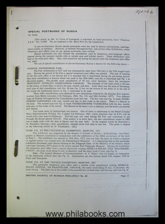 Vovin, Y., Special Postmarks of Russia, Kopie eines russ. Artikels aus 1969 in englischer Übersetzung sowie weitere Kopien anderer Veröffentlichungen über die Stempel von Russland u.a. von Skipton, alles in englisch #65998