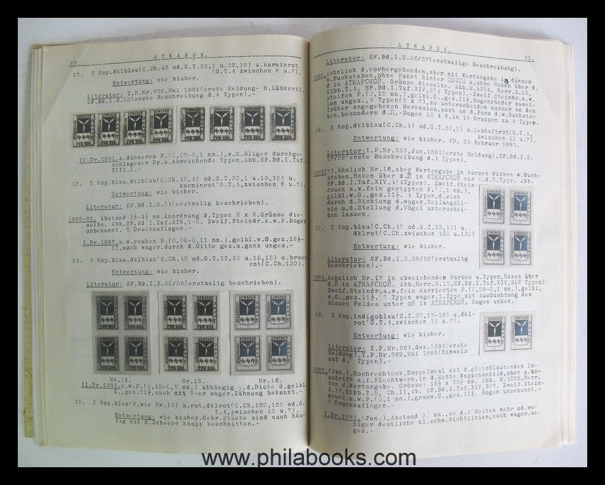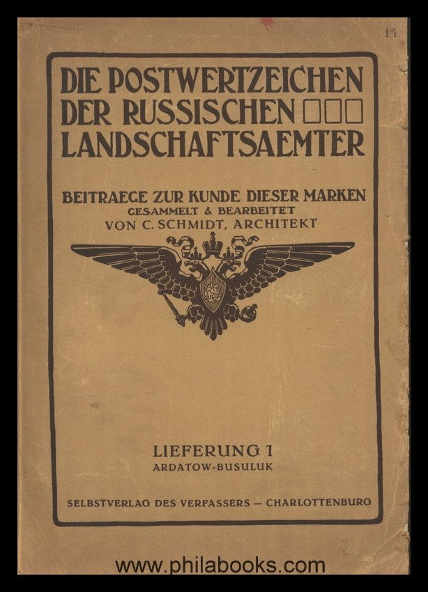 Schmidt, C., Die Postwertzeichen der Russischen Landschaftsaemter, Beiträge zur Kunde dieser Marken, gesammelt & bearbeitet von C. Schmidt, Architekt, Selbstverlag des Verfassers- Charlottenburg, Lieferung 1, Ardatow-Busuluk, 1934, 104 S., mit vom Autor selbst eingeklebten Fotographien von Marken aus seiner legendären Sammlung, Auflage nur 50 nummerierte Exemplare, hier Nr. '14', das seltene Werk besteht aus insgesamt 8 Lieferungen, Vorderumschlag rechts Randmängel, die ersten 8 Seiten nur als einfache KOPIE sauber eingebunden. #66085