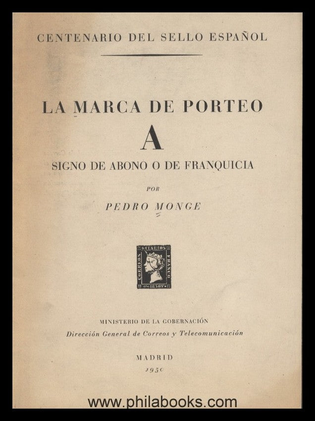 Monge, P., Centenario del Sello Espanol, La Marca de Porteo, A Signo de Abono de Franquicia, Ministerio de la Gobernación, Dirección General de Correos y Telecomunicatión, Madrid, 1950, Vorphila-Stempelkatalog mit Abb., 19 S. #66246