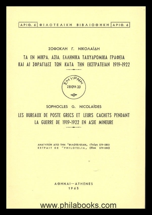 Nicolaides, S. G., Les Bureaux de Poste Grecs et leurs Cachets Pendant la Guerre de 1919-1922 en Asie Mineure, 1963, 6 S., mit Abb., Band 6 der Bibliothèque Philotélique Hellénique, zweisprachig griechisch/französisch #66438