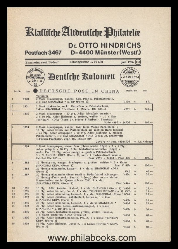 Hinrichs, Dr. Otto, Klassische Altdeutsche Philatelie, Preisliste vom Juni 1986, Deutsche Kolonien, Preussen Nummernstempel, Literatur, 20 S., 826 Lose, ohne Abb. #66448