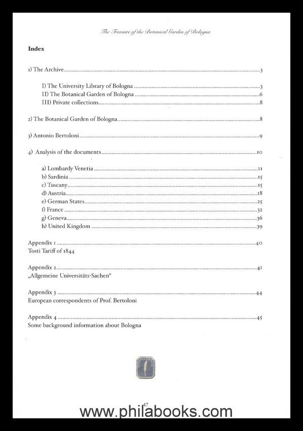 Mathà, Dr. T., The Treasure of the Botanical Garden of Bologna, Printed Matters, warppers and letters from European Cities to the Head of the Botanical Garden of Bologna 1834-1852, 2015, Dokumentation einer Archiv-Auswertung, 47 S., mit zahlreichen farbigen Abbildungen von Vorphila-Belegen #66754