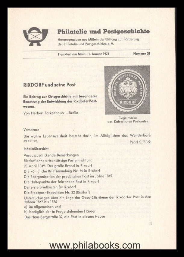 RIXDORF: Fätkenheuer, H., Rixdorf und seine Post, Ein Beitrag zur Ortsgeschichte mit besonderer Beachtung der Entwicklung des Rixdorfer Postwesens, in Philatelie und Postgeschichte Heft Nr. 20, 1973, umfasst das ganze Heft, 23 S., mit Abb. #66799