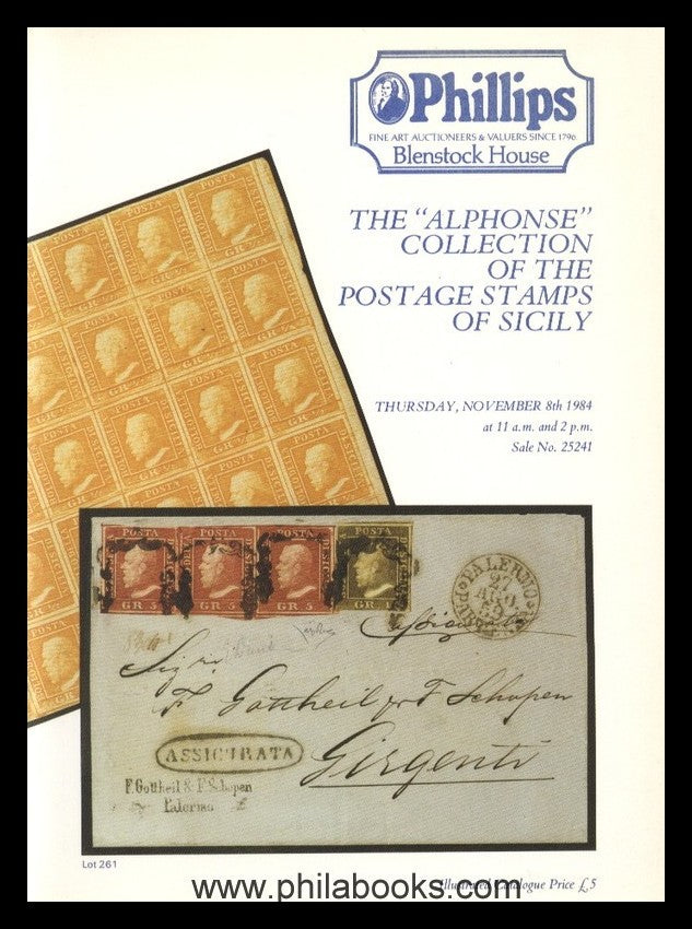Phillips, The 'Alphonse' Collection of the Postage Stamps of Sicily, London, 08.11.1984, 431 Lose, mit zahlr. farbigen Abb., überwiegend Belege, interessanter und gesuchter Katalog, es handelt sich um die ehemalige Alphonse de Rothschild-Sammlung! #66896
