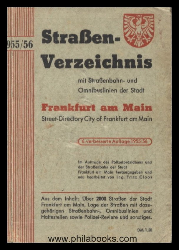 FRANKFURT AM MAIN: Straßenverzeichnis mit Straßenbahn- und Omnibuslinien der Stadt Frankfurt am Main, Über 2000 Straßen, Lage der Straßen mit dazugehörigen Straßenbahn-, Omnibuslinien und Haltestellen sowie Polizei-Reviere und sonstiges, 6. verbesserte Auflage 1955/56, 128 S. #67210