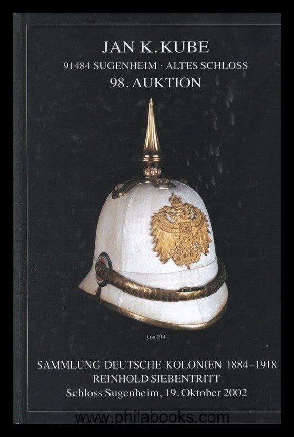 Kube, J. K., 98. Auktion/Sammlung Deutsche Kolonien 1884-1918, Reinhold Siebentritt, 19.10.2002, 756 Lose, mit zahlr. Abb., einige farbig, enthält nur wenige philatelistische Stücke, sondern den ganzen allgemeinen Teil 'Kolonien' der Sammlung Siebentritt von Uniformen über Orden, Bücher, Urkunden, Bilder etc., Festeinband, gut erhalten, leidiglich der Einband geringe Gebrauchsspuren, mit EL #67634