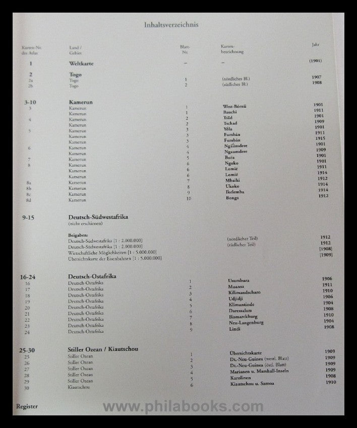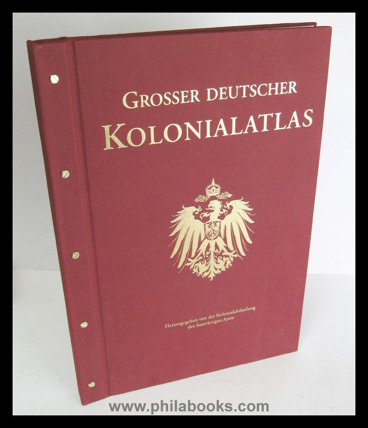 Grosser Deutscher Kolonialatlas. Bearbeitet von Paul Sprigade und Max Moisel. Herausgegeben von der Kolonialabtheilung des Auswärtigen Amts. (Neudruck der Origianlausgabe): Berlin, Reimer (Ernst Vohsen) 1901-1915, Format 37,8 x 55,5cm, mit 39 sehr detallierten, farbigen Einzelkarten, davon 34 ausklappbar. Kunstleder mit Goldprägung und Schraubbindung, sehr gut erhalten! #67696