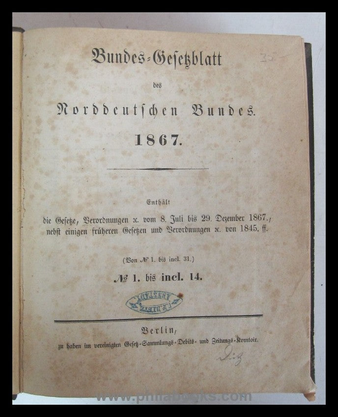 1867, 1869, 1870, Bundes-Gesetzblatt des Norddeutschen Bundes in 3 Bänden zeitgenössisch gebunden, Einbände etwas unterschiedlich erhalten, jedoch keine gravierenden Mängel, innen gut , feste Bindung, darin u.a. die Postverträge mit Italien, Schweden etc., Portofreiheiten etc. #67786