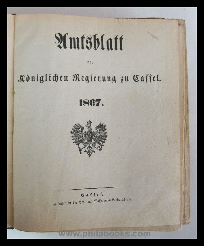 1867 und 1868, Amtsblatt der Königlichen Regierung zu Cassel, 2 Bände, zeitgenössisch in Halbleder gebunden, mit Inhaltsverzeichnis, Sachregister und Beilagen, äusserlich stärkere Gebrauchsspuren, sonst gut, feste Bindung, enthält interessante Informationen für den forschenden Postgeschichtler zum Post-und Verkehrswesen, die mit dem Sachregister aufgefunden werden können. #67787