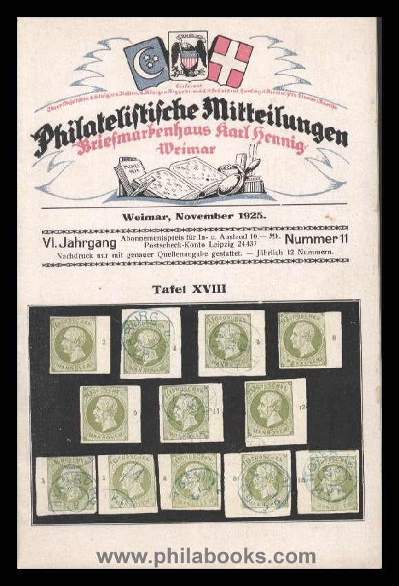 Hennig Philatelistische Mitteilungen, VI. Jg., 1925, Heft 11 mit einem längeren Beitrag von Heinrich Birnbach, Berlin, über die Hannover-Randnummern u. Randinschriften,mit vielen Abb., Heftung etwas rostfleckig, sonst gut #67946