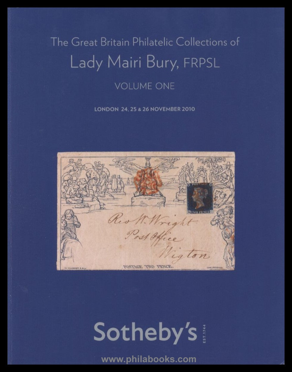 Sotheby's, The Great Britain Philatelic Collections of Lady Mairi Bury, FRPSL, London, 24.11.2010, Sonderauktion der bekannten nordirischen Sammlerlin, 2 Bände, zusammen 347 S., 2185 Lose, Schwerpunkt der Sammlung sind die Ausgaben Königin Victorias mit Einheiten, Abstempelungen und Briefen, auch die anderen Ausgaben bis zu den Seepferdchen sind gut vertreten, dabei ungebrauchte Einheiten, Essais etc., gesuchte Auktionskataloge, sehr gut erhalten #68097