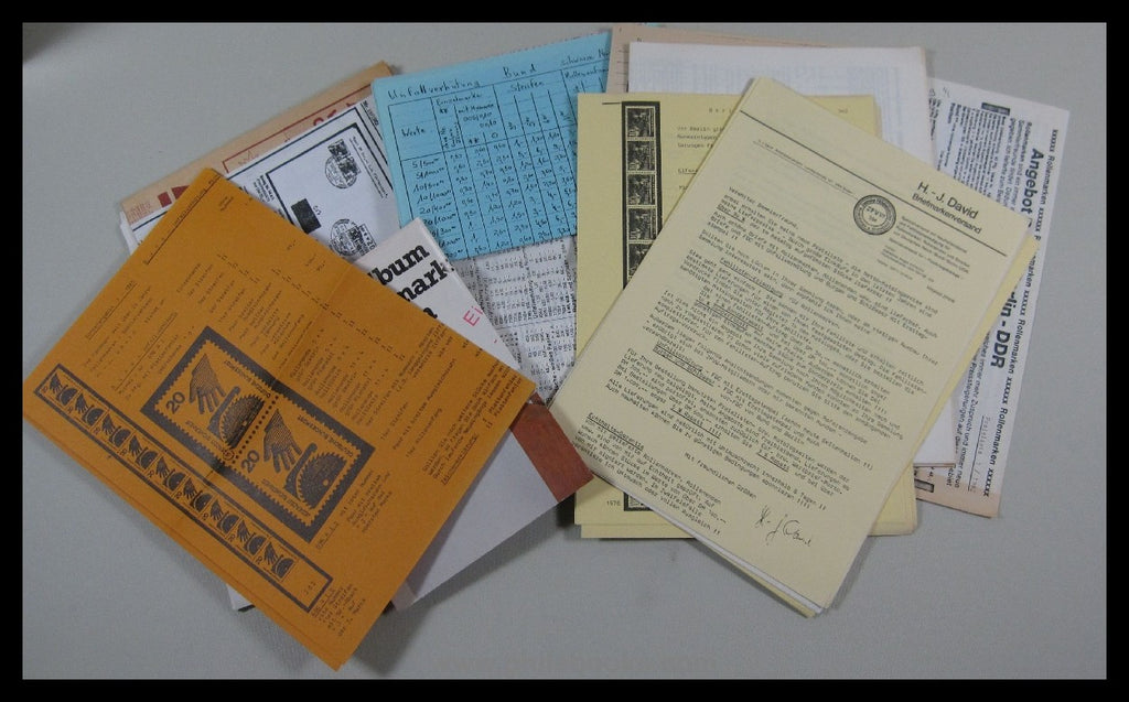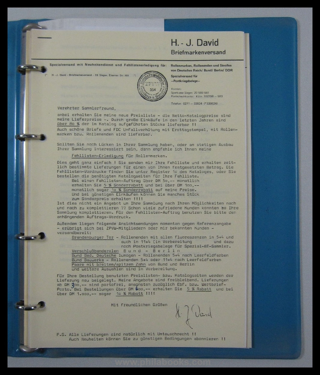 David, H.J., Briefmarkenversand für Rollenmarken Deutsches Reich, Bund, Berlin, hier ein prall gefülltes A5-Ringbuch mit Preislisten-und Katalogen, teils auch von anderen Firmen aus den 1970 und 1980er Jahren und Sammlerunterlagen ex C. Muys #68314