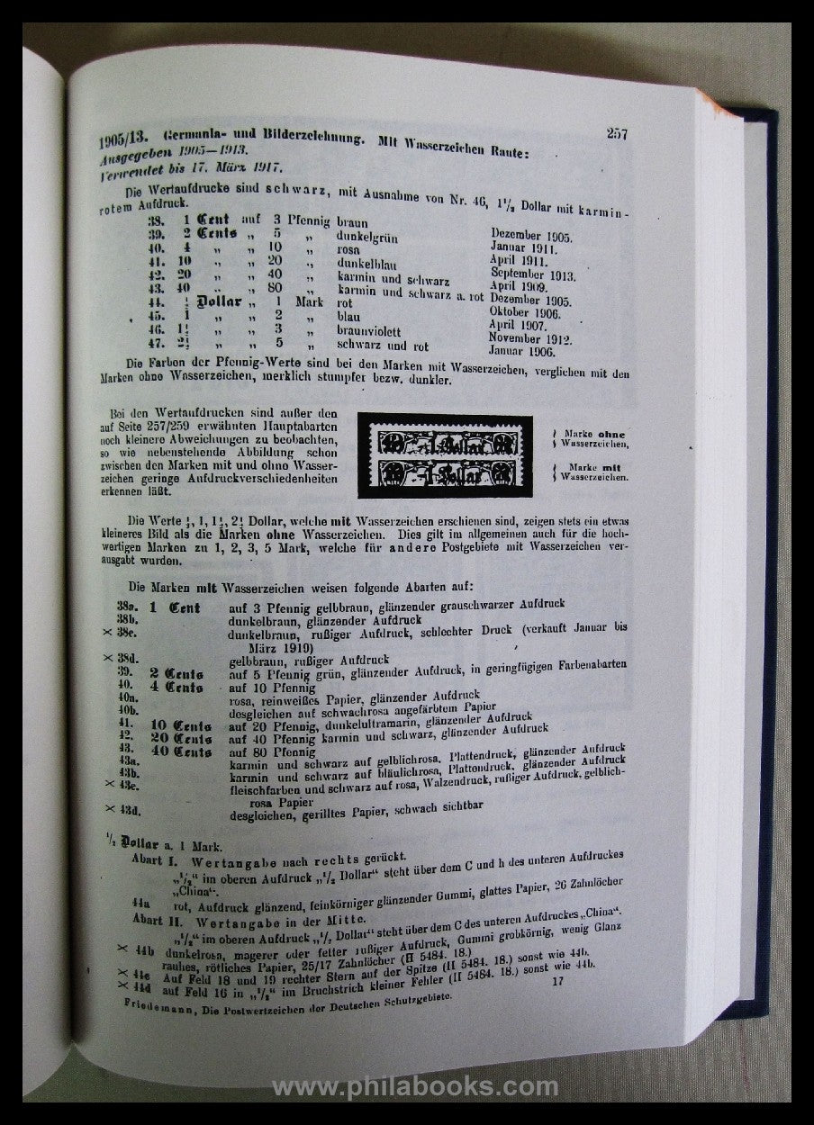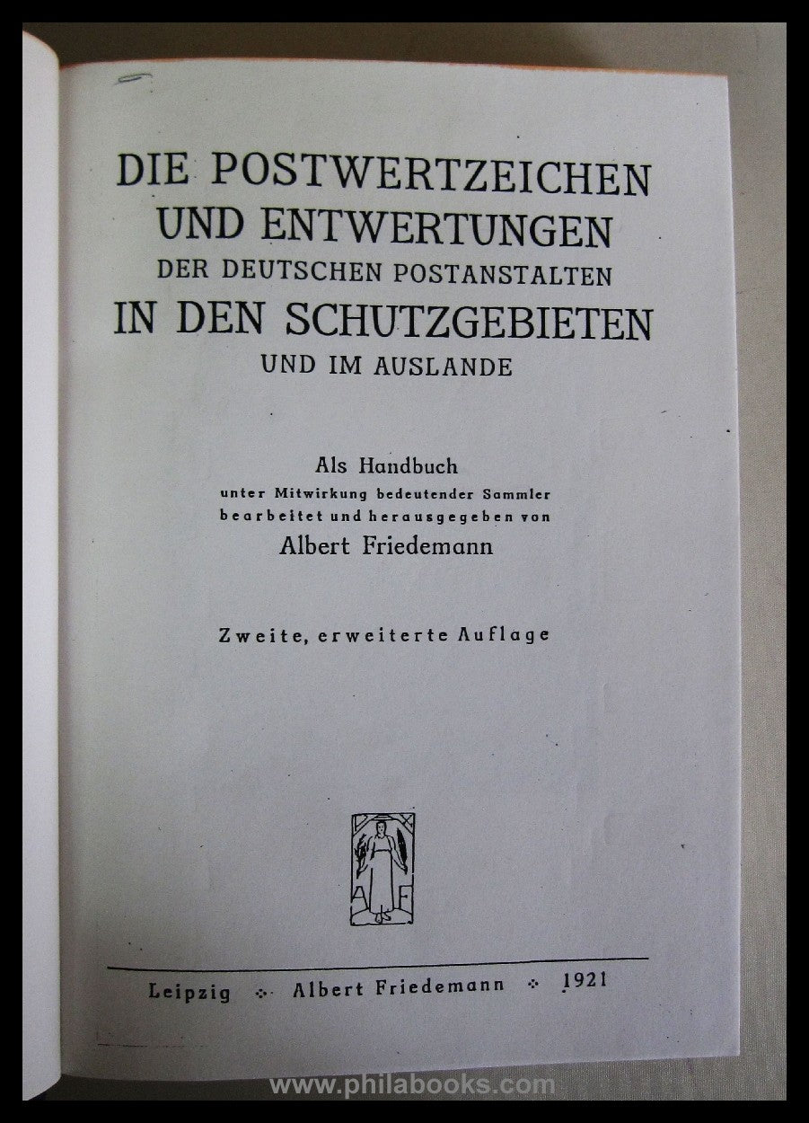Friedemann, A., Die Postwertzeichen und Entwertungen der deutschen Postanstalten in den Schutzgebieten und im Auslande, 1921, 2. erweiterte Auflage, 447 S., hier als gute EINZELKOPIE, einseitig bedruckt, oben mit Farbschnitt und bestens in Leinen gebunden mit Rückenprägung, seh gut erhalten #69134